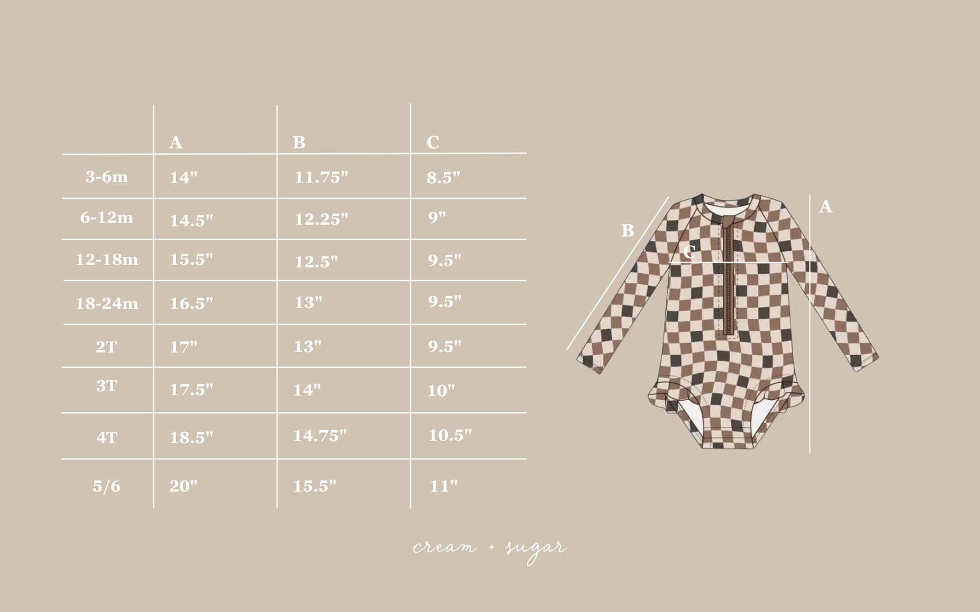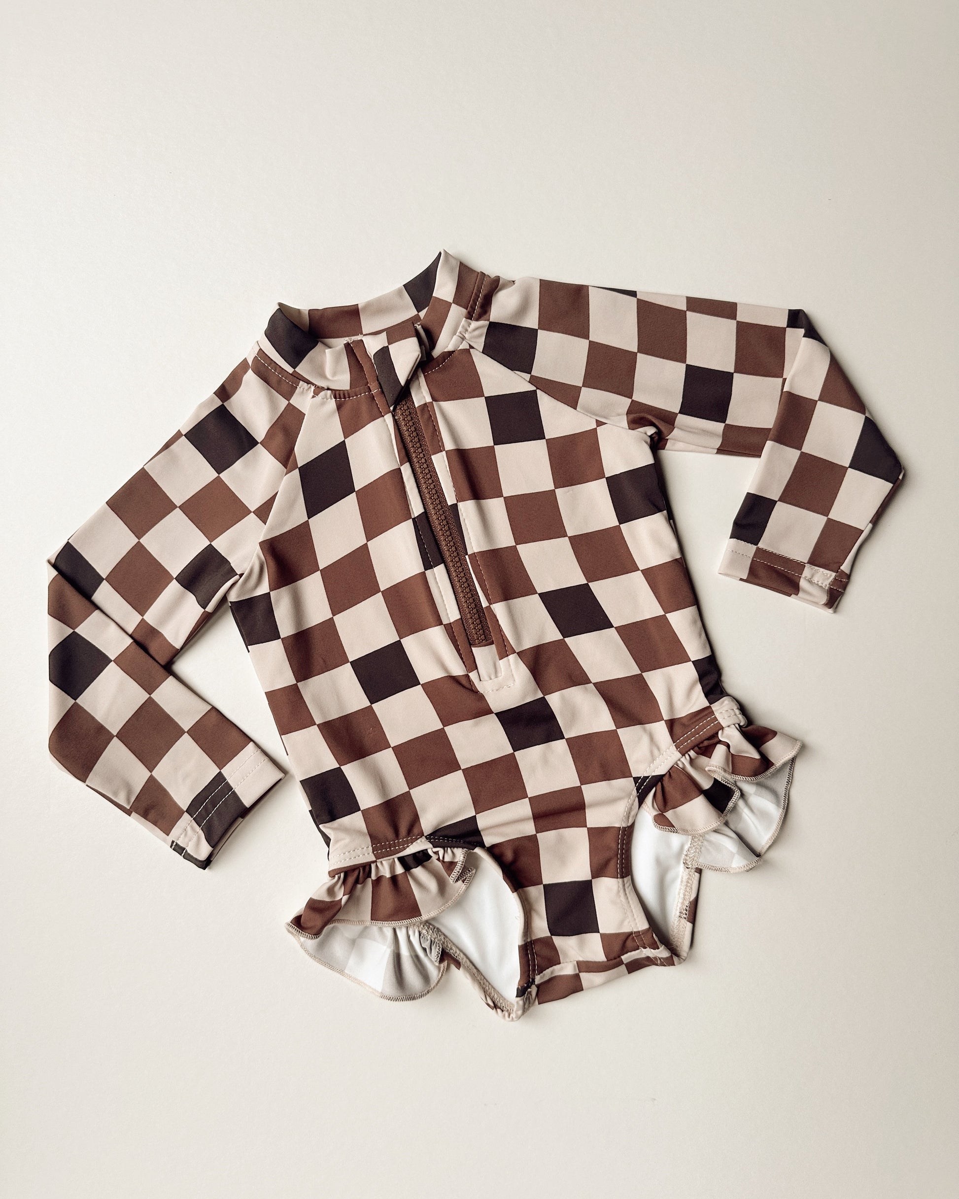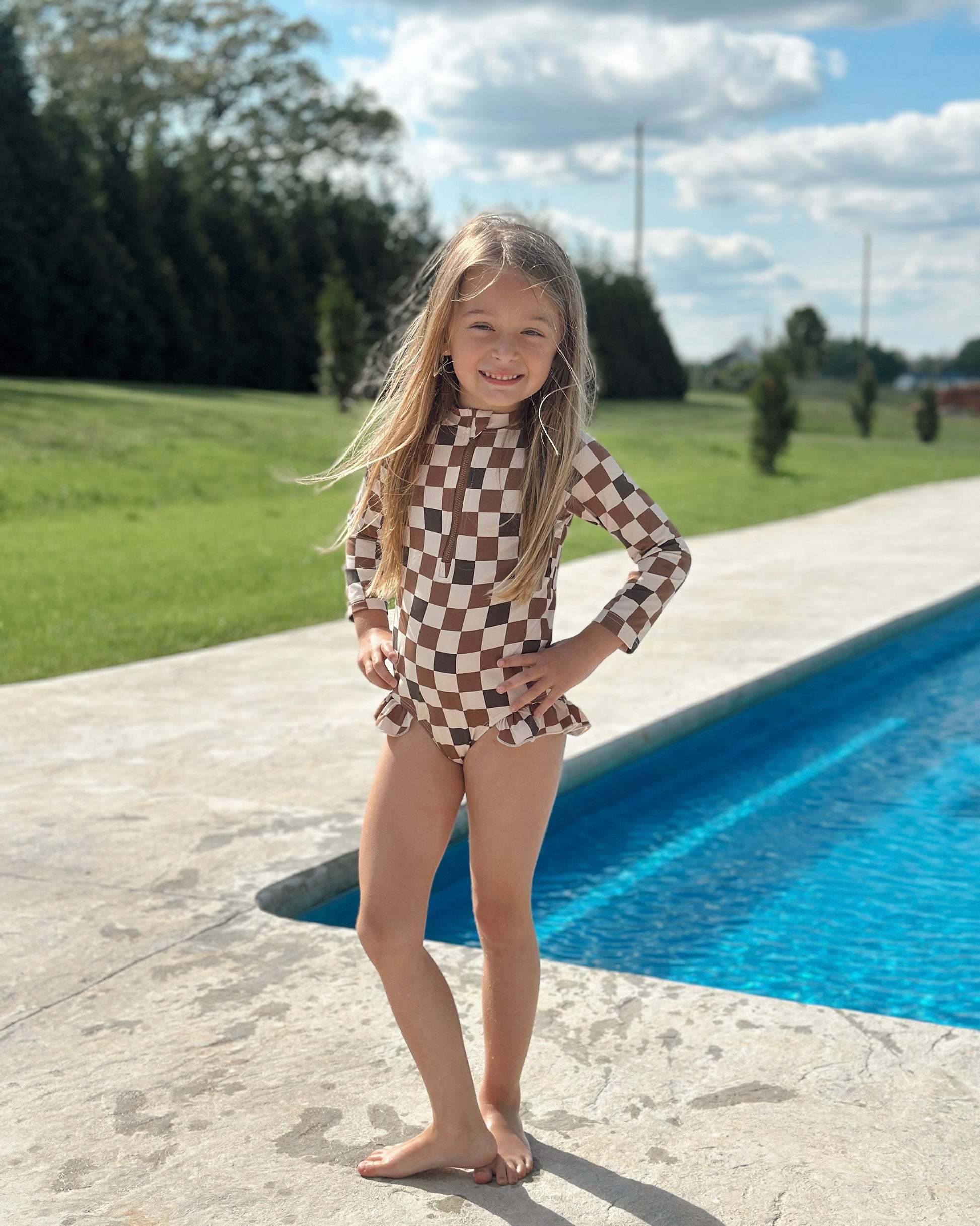 Our Cream and Sugar Kids one-piece features a zipper in the front, long sleeves for sun protection and the sweetest ruffle details on the legs!